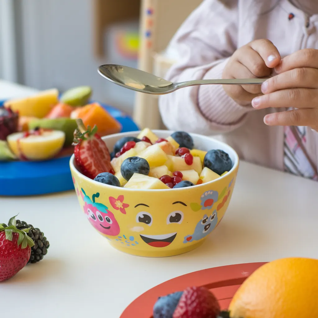 Gambarkan salad buah yang disajikan dalam mangkuk dengan wajah ceria, menonjolkan kesegaran dan keberagaman buah.