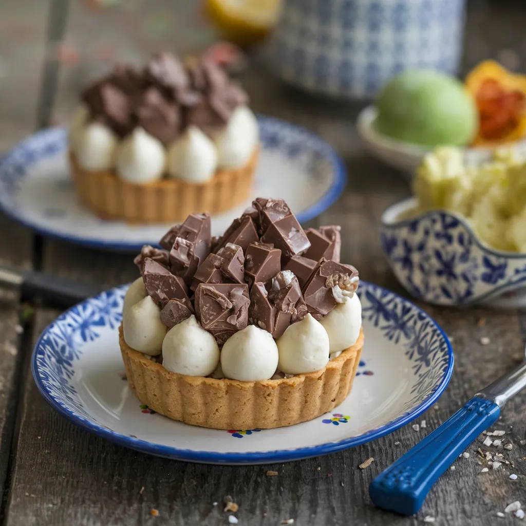 Ilustrasikan kue tart yang dihias dengan kristal cokelat, menciptakan tampilan yang elegan dan menggoda.