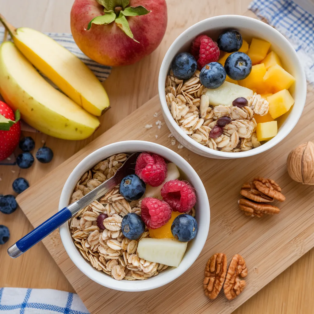 Gambarkan mangkuk oatmeal yang dihias dengan potongan buah dan kacang, menciptakan tampilan yang sehat dan mengundang selera.