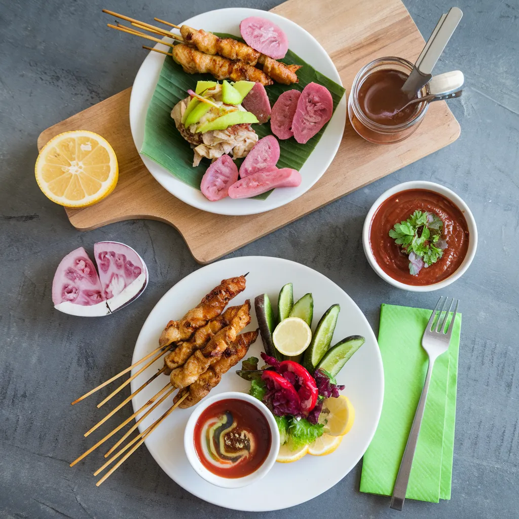 Tambahkan sambal dengan warna-warni pelangi di sekitar sate ayam, memberikan sentuhan kreatif dan ceria pada hidangan tradisional.