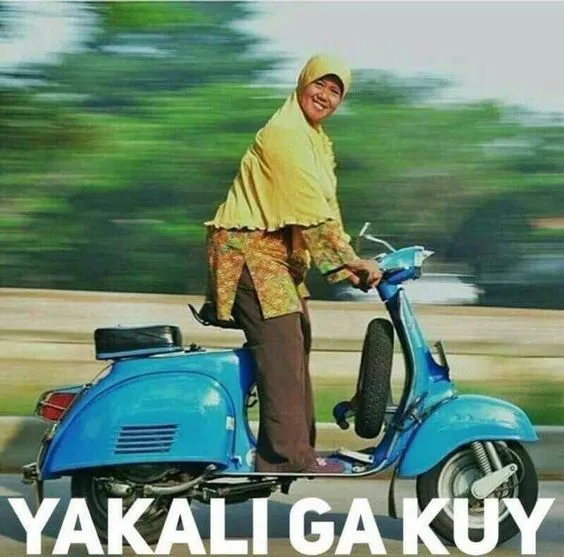 Kesan tampilan gambar tersebut adalah lucu, unik, dan mengundang senyuman. Gambar menggambarkan seorang emak-emak yang berkedara dengan penuh gaya dan kepercayaan diri menggunakan vespa, sambil berdiri dengan sikap yang anggun dan tersenyum manis. Tulisan “yakali ga kuy” menambahkan nuansa humor pada gambar, seakan-akan menggambarkan bahwa si emak-emak dengan penuh percaya diri menantang orang lain untuk mencoba melakukannya juga.