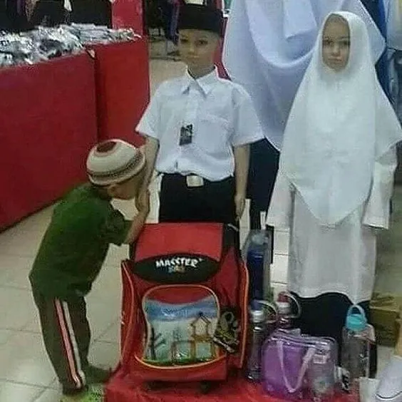 Kesan tampilan gambar tersebut adalah lucu dan menggemaskan. Gambar ini menggambarkan seorang anak yang sangat cerdik dan kreatif dalam mencari cara untuk mendapatkan minuman untuk kedua kalinya. Dia menyadari bahwa dengan menyamar menggunakan jilbab, dia bisa terlihat berbeda dan mungkin saja berhasil memperoleh minuman lagi.