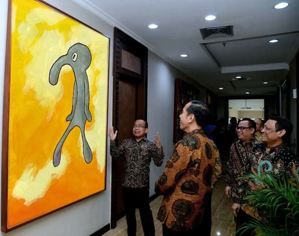 Kesan tampilan gambar tersebut adalah lucu dan mengundang gelak tawa. Kontras antara ekspektasi dan kenyataan yang dihadirkan dalam gambar ini menciptakan situasi yang kocak. Para pejabat dan orang penting yang seharusnya melihat karya lukisan yang indah dan berarti justru disuguhkan dengan lukisan milik Squidward, sebuah karakter kartun lucu dari SpongeBob SquarePants.
