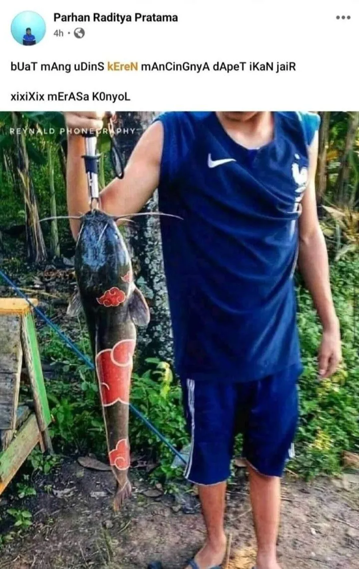 Kesan tampilan gambar meme lucu seorang pria menunjukkan hasil pancingannya seekor ikan lele besar dengan motif awan merah Akatsuki adalah kombinasi antara situasi kocak dan referensi ke dunia anime atau manga. Di sisi humor, gambar tersebut menunjukkan betapa besar dan menariknya ikan lele yang berhasil dipancing oleh pria tersebut. Namun, tambahan motif awan merah Akatsuki pada tubuh lele membuatnya terlihat unik dan lucu karena mencampurkan dunia nyata dengan elemen dari cerita fiksi.