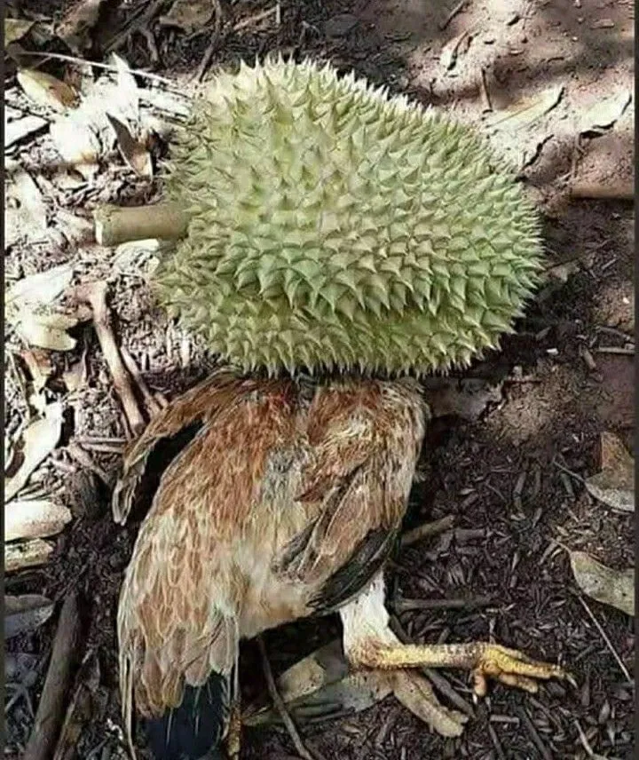 Kesan humor dalam gambar ini mungkin bisa mengundang tawa karena absurditas dari situasi yang digambarkan, yaitu bagaimana ayam bisa mati akibat tertimpa oleh buah durian. Namun, sekaligus juga menimbulkan perasaan sedih karena menggambarkan kematian seekor makhluk hidup.