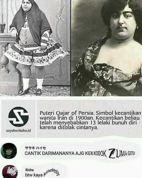 Berikut kalian akan melihat sebuah gambar meme lucu mengocok perut seorang putri yang katanya sangat cantik hingga menjadi simbol kecantikan dan bahkan sampai membuat 13 lelaki bunuh diri karena ditolak cintanya oleh diri putri tersebut. Disitu juga terdapat komentar atas gambar wajah putri tersebut, ada yang mengatakan ” CANTIK DARIMANANYA KEK KODOK ZUMA GITU”.