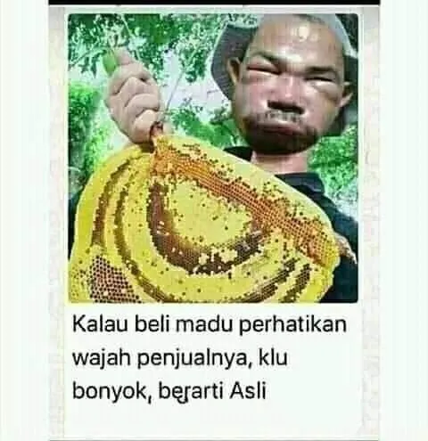 Kesan humor dalam gambar ini terletak pada kontras antara wajah seseorang yang berantakan akibat entupan lebah dengan kalimat yang memberikan petunjuk jenaka tentang cara membedakan madu asli dan palsu. Kalimat tersebut mengandung sentilan mengenai panduan membeli madu, yaitu bahwa jika penjual madu memiliki wajah berantakan seperti yang ditampilkan di gambar, maka kemungkinan besar madunya asli dan masih ada sisa lebahnya.