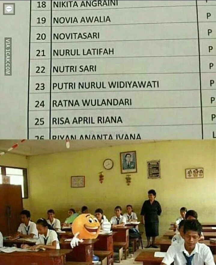 Kesan tampilan gambar meme lucu dengan dua panel ini adalah menggambarkan adegan humor dengan mengedit nama siswa dalam daftar hadir dengan nama “Nutri Sari” dan menampilkan ikon jeruk Nutri Sari di panel kedua yang menunjukkan bahwa jeruk Nutri Sari ikut belajar bersama siswa lainnya. Meme ini bisa dianggap lucu karena memanfaatkan kesamaan kata “Nutri Sari” dengan merek minuman jeruk populer “NutriSari”. Meme ini mengandung unsur humor wordplay dan editing yang membuatnya mengundang gelak tawa, terutama bagi mereka yang familiar dengan merek minuman jeruk tersebut. Penggunaan nama merek dalam konteks yang tidak terduga atau lucu sering kali menjadi daya tarik dalam meme.