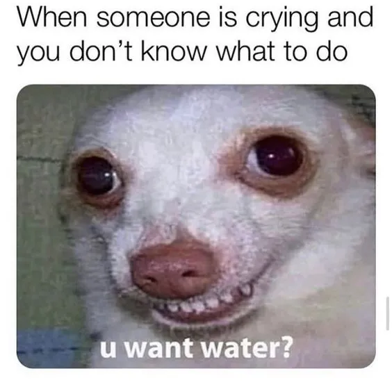 Caption “When someone is crying and you don’t know what to do” menambahkan sentuhan lucu karena menggambarkan situasi khas ketika seseorang merasa tidak tahu bagaimana cara menghadapi atau membantu orang yang sedang bersedih. Pada saat yang sama, caption tambahan “U want water?” menyiratkan bahwa anjing mencoba memberikan bantuan dengan menawarkan air minum, tetapi mungkin kurang tepat dalam situasi tersebut.