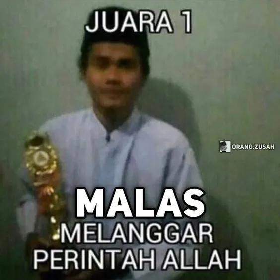 Kesan tampilan gambar lucu seseorang memegang piala lengkap dengan tulisan “Juara 1 Malas Melanggar Perintah Allah” adalah kombinasi humor dan pesan moral. Dalam gambar tersebut, seseorang sedang memegang piala seolah-olah telah memenangkan sebuah kompetisi atau perlombaan yang tidak biasa. Tulisan “Juara 1 Malas Melanggar Perintah Allah” menambahkan elemen humor karena lazimnya piala diberikan untuk prestasi luar biasa atau prestasi olahraga, bukan untuk perilaku malas atau tidak patuh terhadap perintah agama. Oleh karena itu, kontras antara tema lazimnya piala dan pesan moral dalam tulisan tersebut menciptakan kesan lucu.