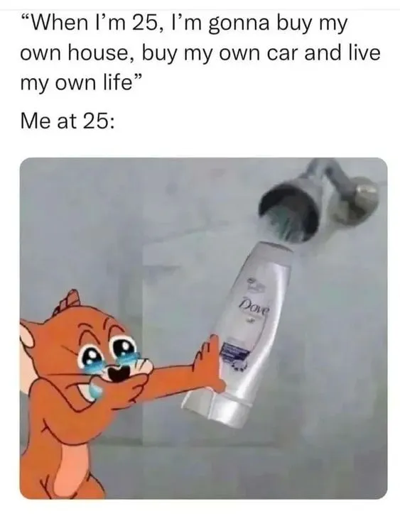 Kesan tampilan gambar meme tersebut adalah lucu dan menggemaskan. Gambar kartun Jerry, karakter dari serial kartun Tom and Jerry, sedang memasukkan air ke dalam botol shampoo, lengkap dengan kutipan “When I am 25, I am gonna buy my own house, buy my own car, and live my own life, me at 25.” Meme ini mungkin bertujuan untuk menyindir harapan dan impian yang besar dari Jerry saat ini, namun sedikit absurd karena ia hanyalah seekor tikus kartun. Penggunaan gambar Jerry yang sedang melakukan hal yang konyol, yaitu memasukkan air ke dalam botol shampoo, menambahkan sentuhan humor dalam meme ini.
