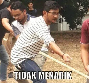 Tingkah laku pria tersebut yang hanya berpura-pura menarik tali tambang tanpa menyentuhnya, membuatnya terlihat lucu dan mengundang tawa. Pilihan gambar ini memberikan kesan humor karena menggambarkan tingkah laku yang aneh dan tidak masuk akal. Kemungkinan, meme ini dapat digunakan untuk menggambarkan seseorang yang “berpura-pura” berusaha tetapi sebenarnya tidak melakukan apa pun atau hanya pura-pura terlibat dalam sesuatu.