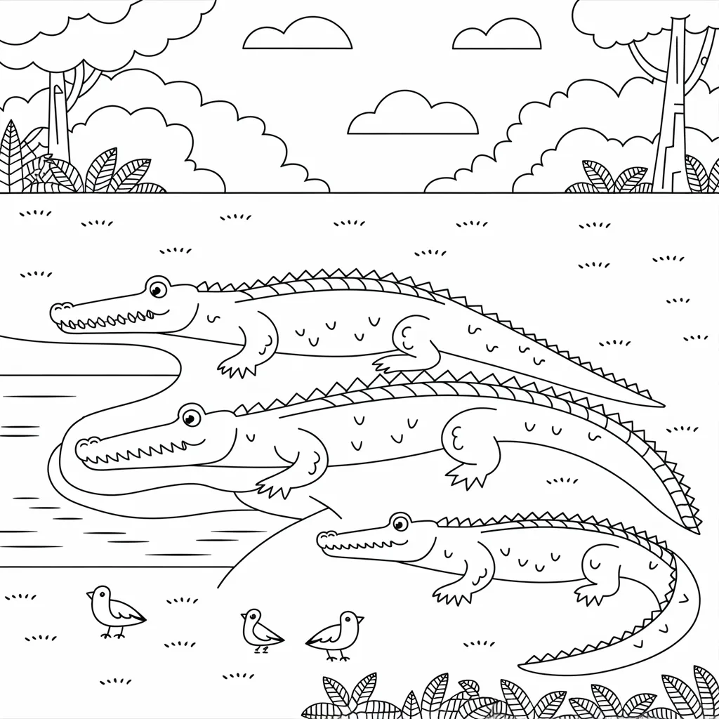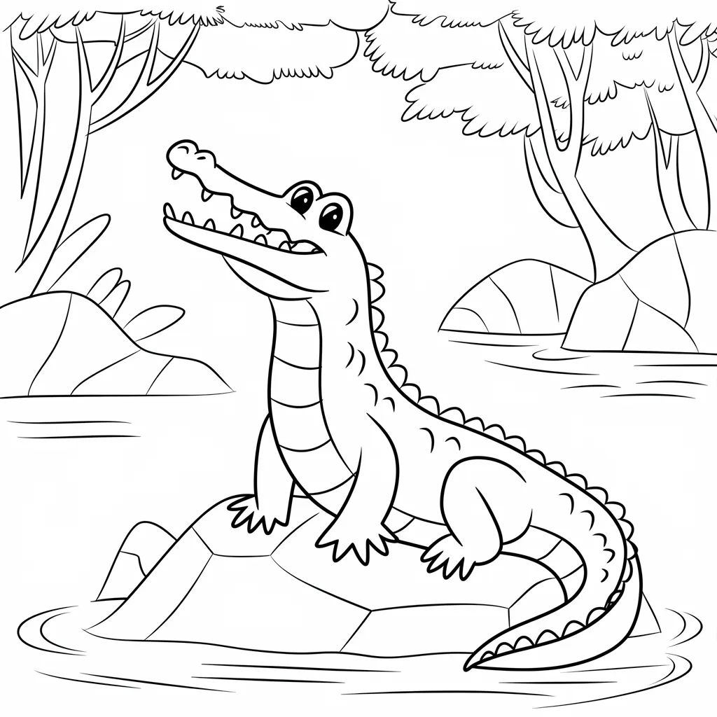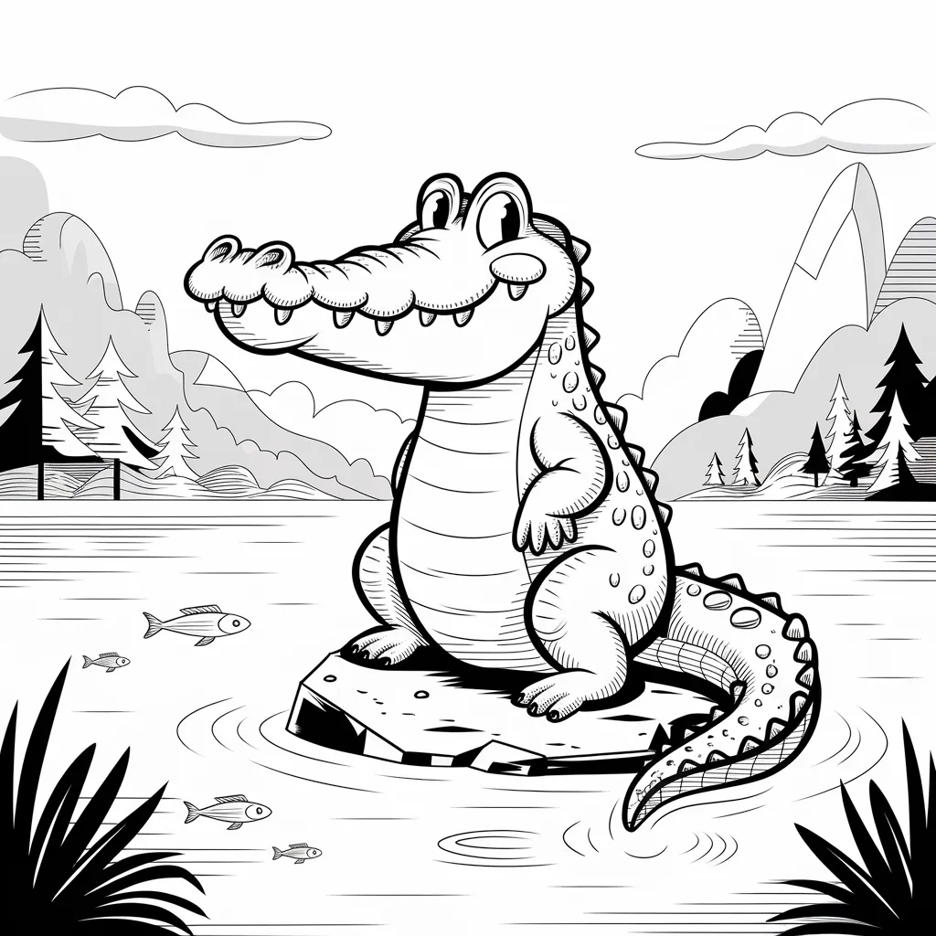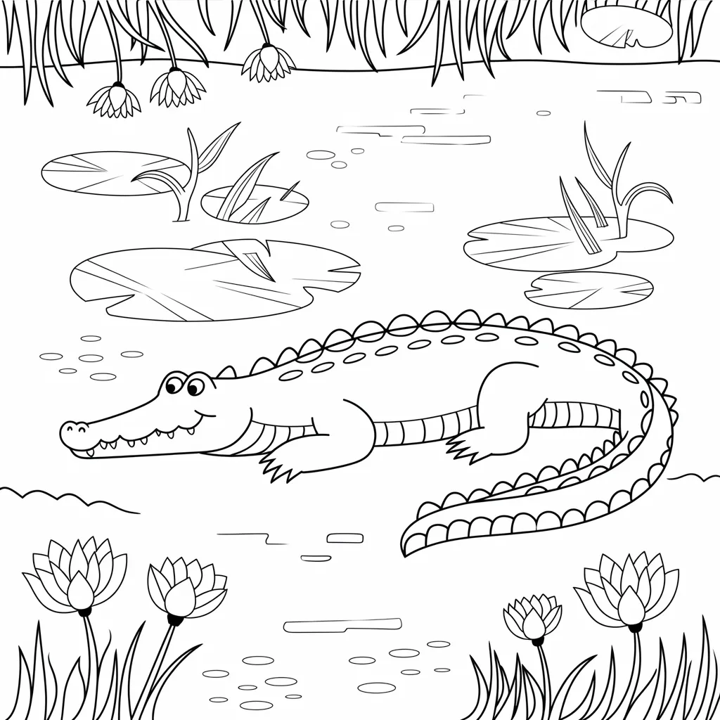 Ilustrasi yang menonjolkan detail sisik tebal di tubuh buaya, cocok untuk melatih ketelitian.