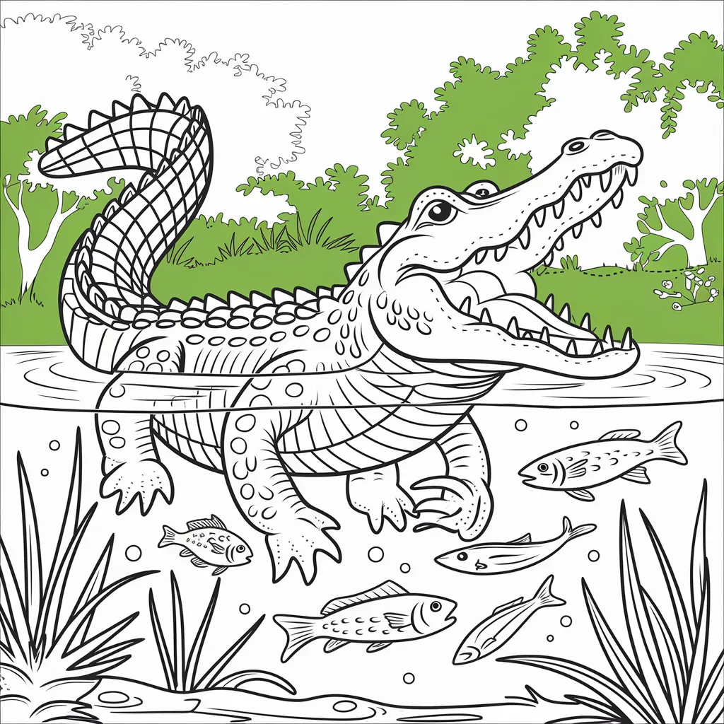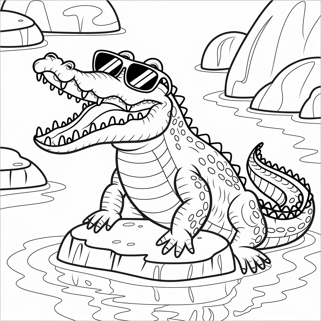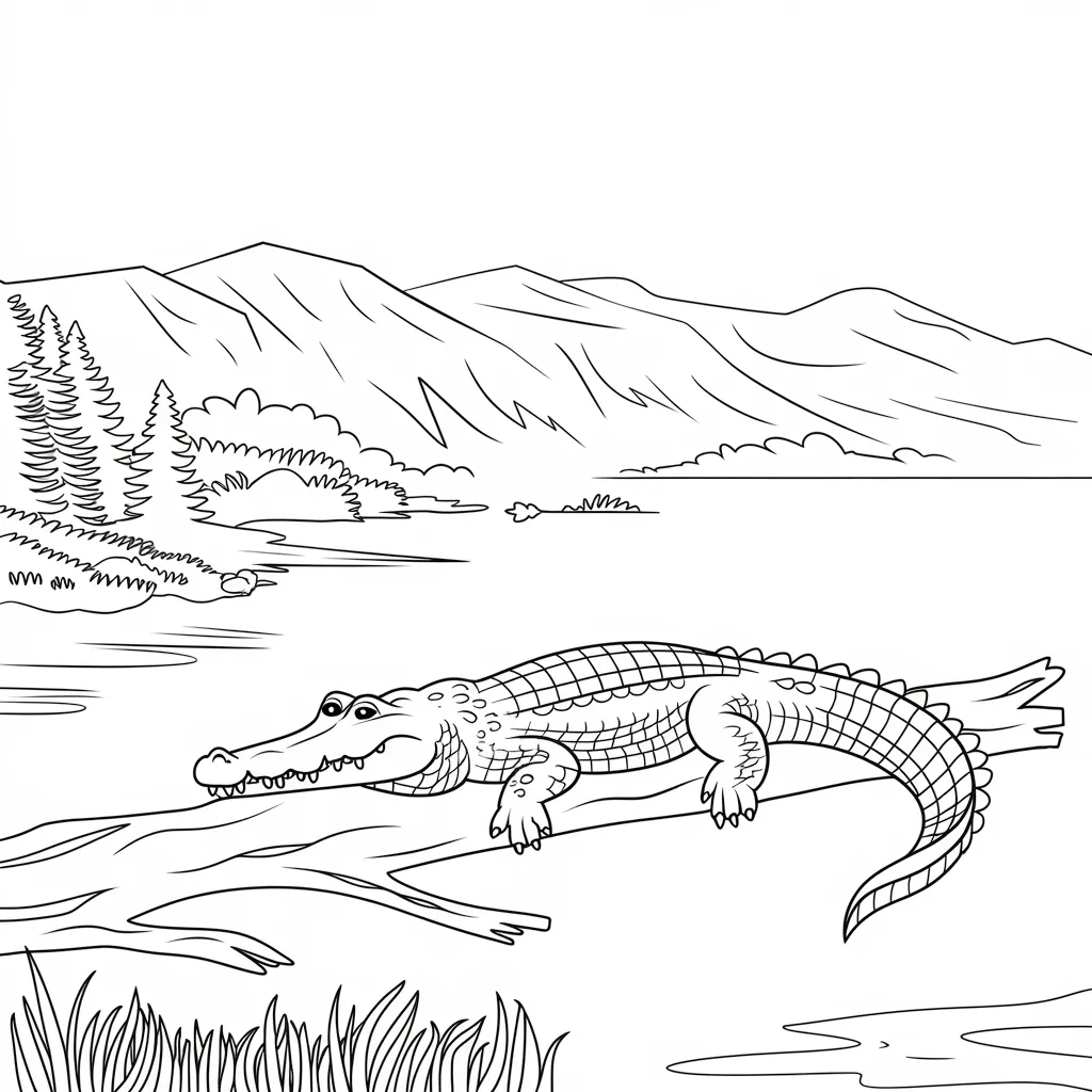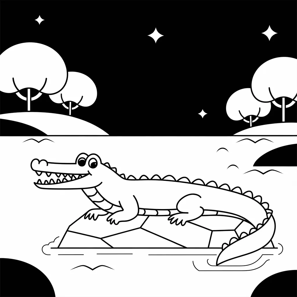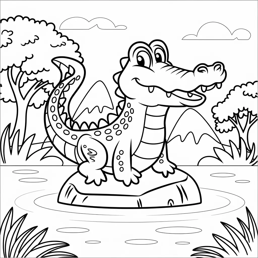 Ilustrasi yang menonjolkan detail sisik tebal di tubuh buaya, cocok untuk melatih ketelitian.