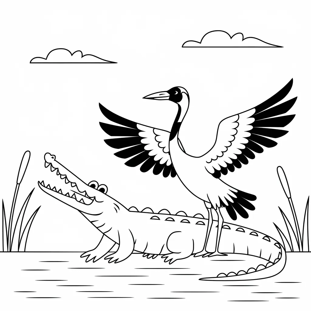 Ilustrasi buaya yang didekati burung kecil, menambah kesan harmonis di alam pembohong.