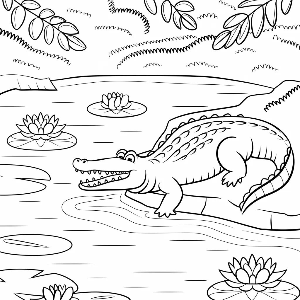 Gambar buaya di antara tanaman air dan ganggang, memperluas pengetahuan anak tentang lingkungan perairan.