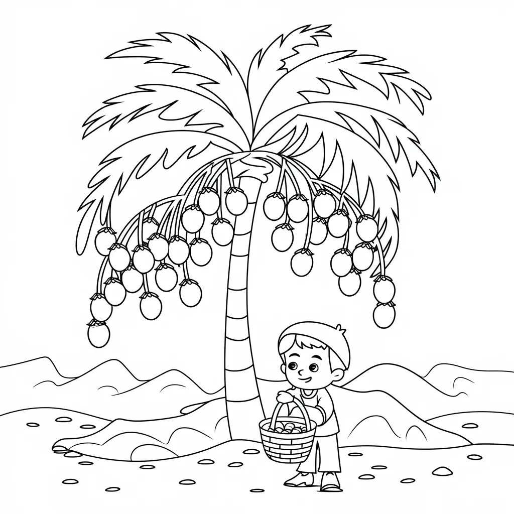 Pohon kurma dengan buah yang siap dipetik, simbol makanan berbuka puasa.