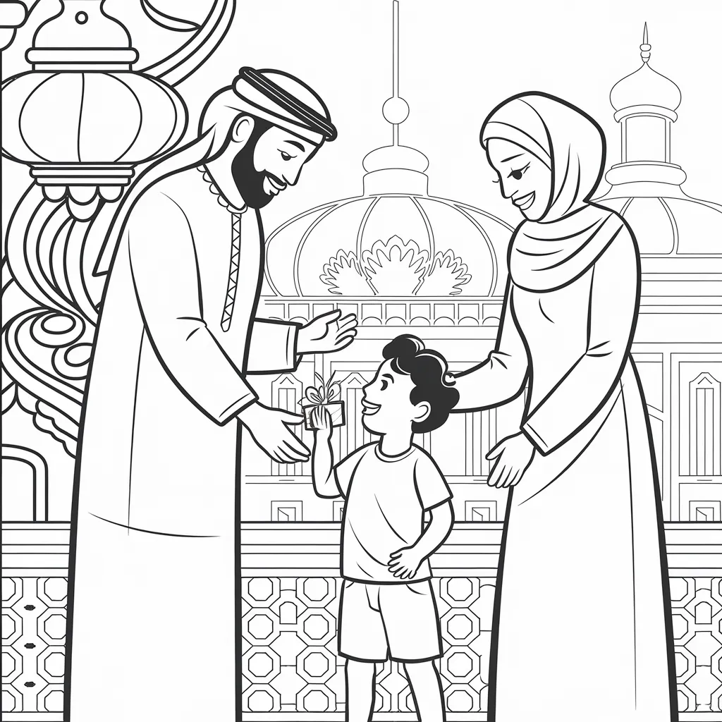 Gambar perayaan Idul Fitri dengan keluarga saling bermaafan dan mengenakan pakaian baru.