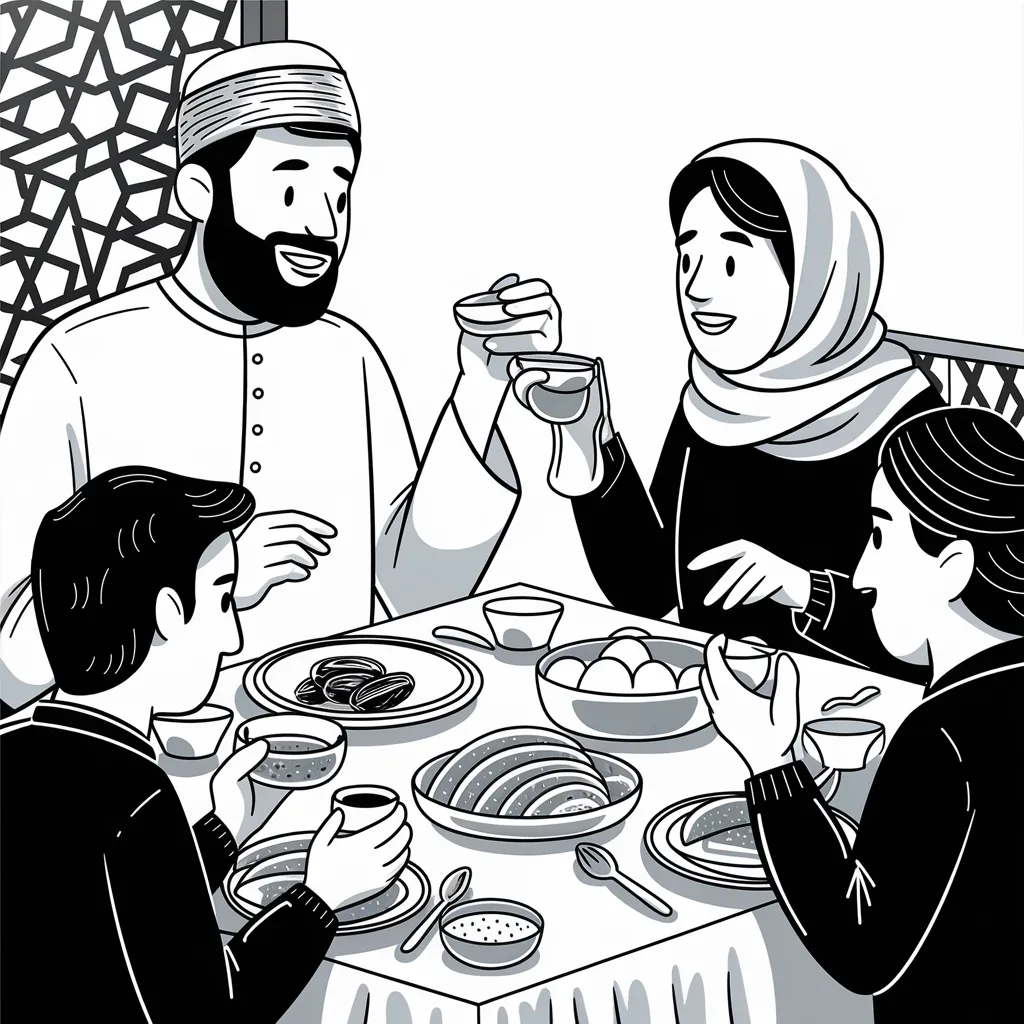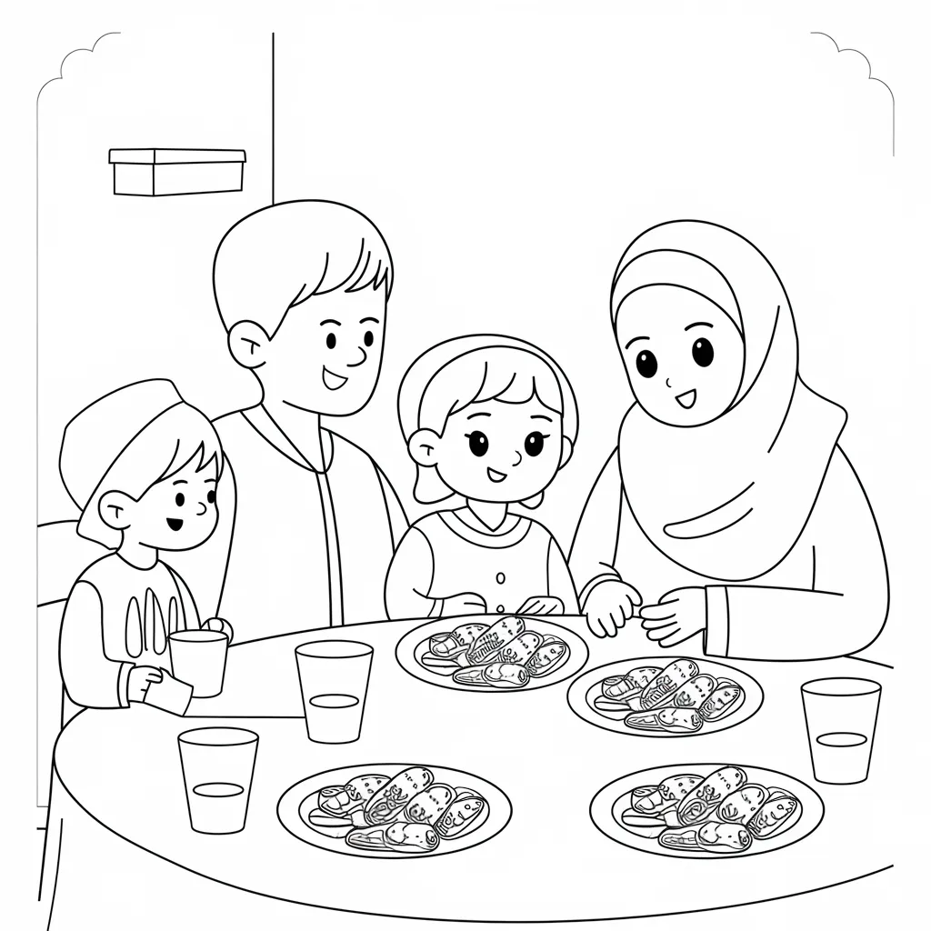 Keluarga duduk di meja makan dengan hidangan khas Ramadhan seperti kurma dan air putih.