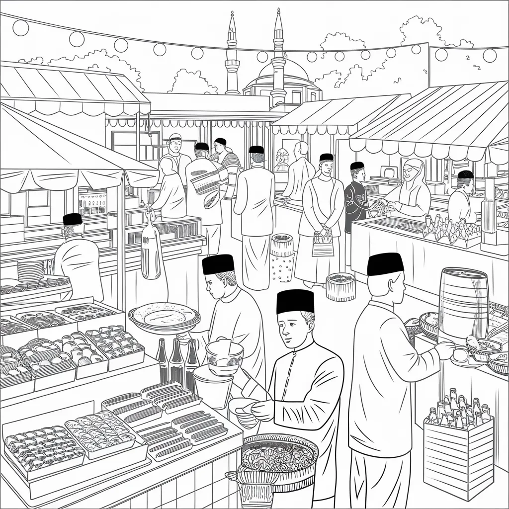 Suasana pasar malam Ramadhan dengan berbagai penjual makanan dan minuman.