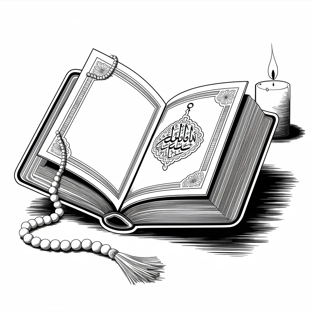 Gambar kitab suci Al-Quran terbuka dengan tasbih di sekitarnya.