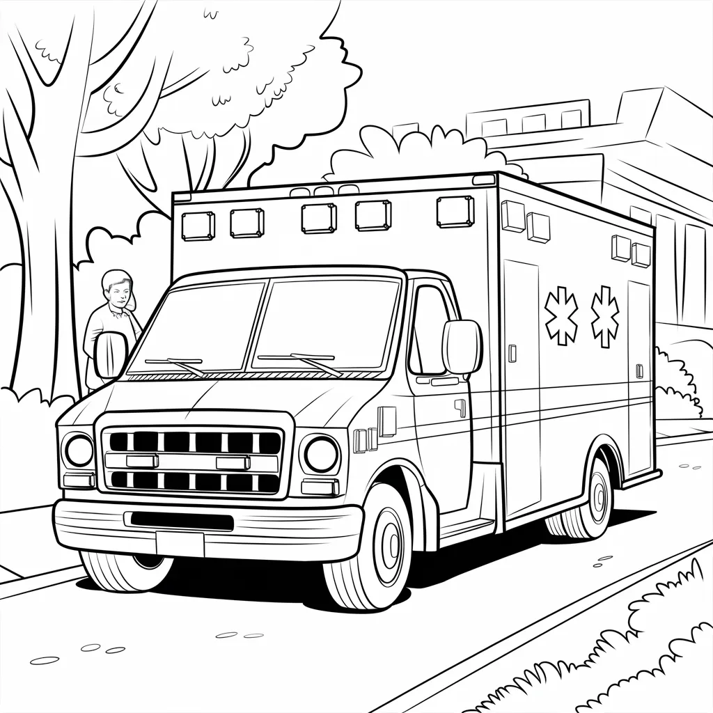 Ilustrasi ambulans dengan sirene, mengenalkan kendaraan yang digunakan dalam keadaan darurat medis.