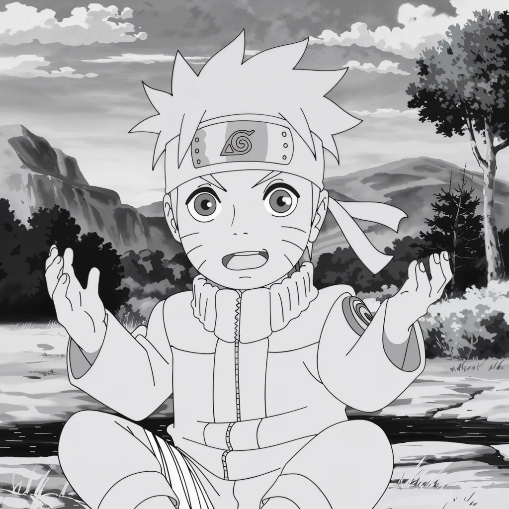Gambar Naruto saat masih kecil dengan senyum ceria dan bandana Konoha.