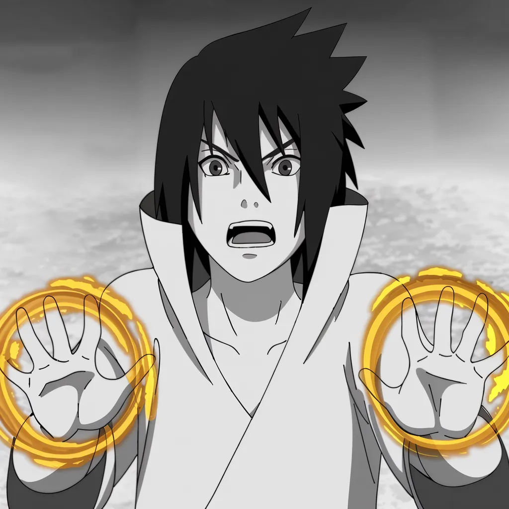 Potret Sasuke dengan mata Sharingan aktif, menunjukkan detail mata yang khas.