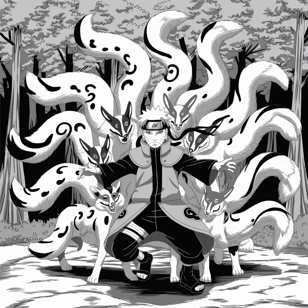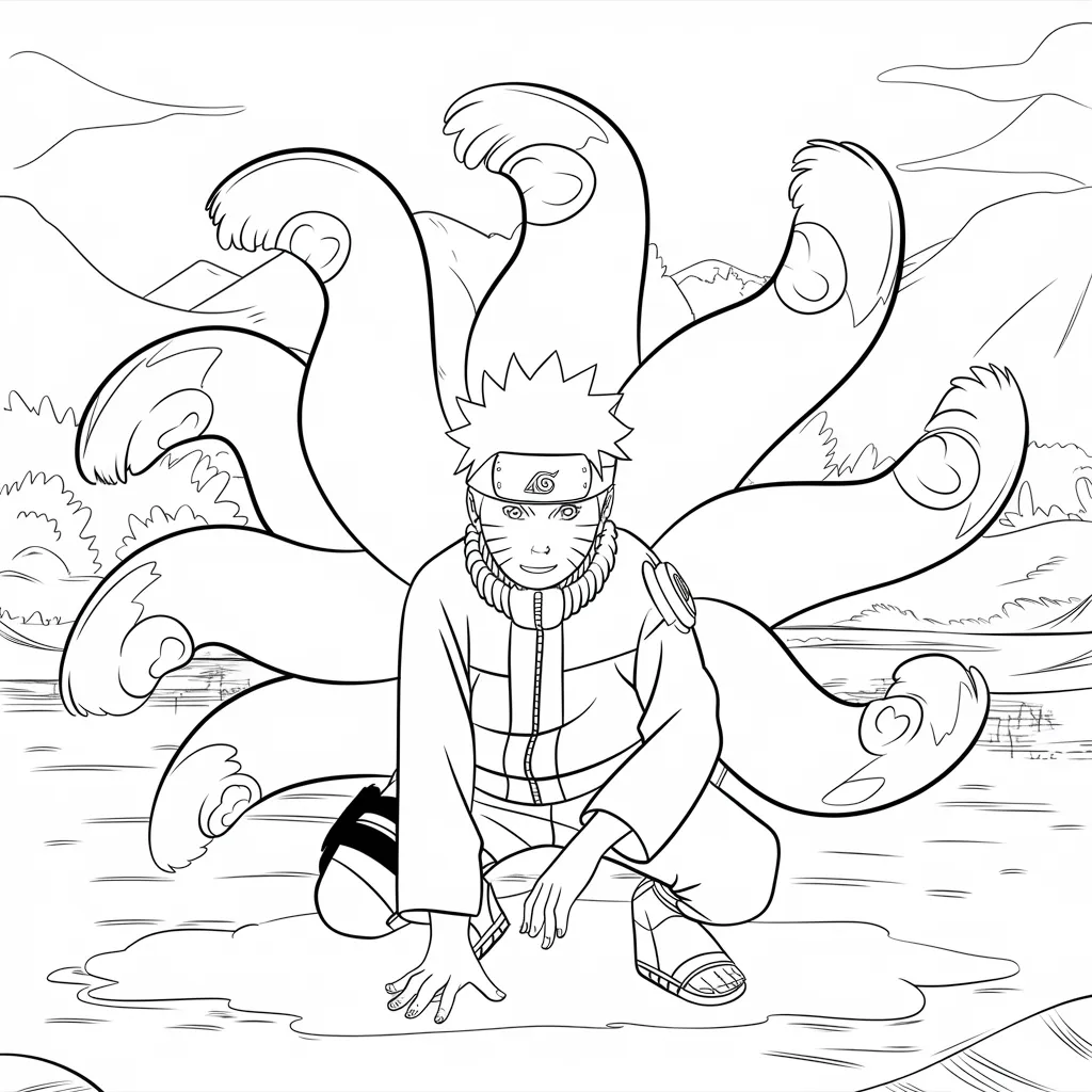 Gambarlah Naruto saat mengaktifkan chakra Kurama, menampilkan ekor dan aura energinya.