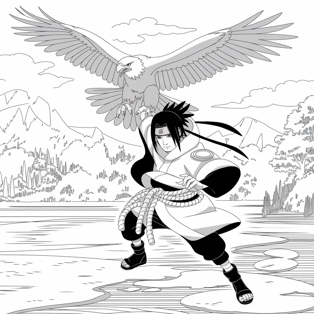 Sasuke bersama elang panggilannya dalam pose dinamis.