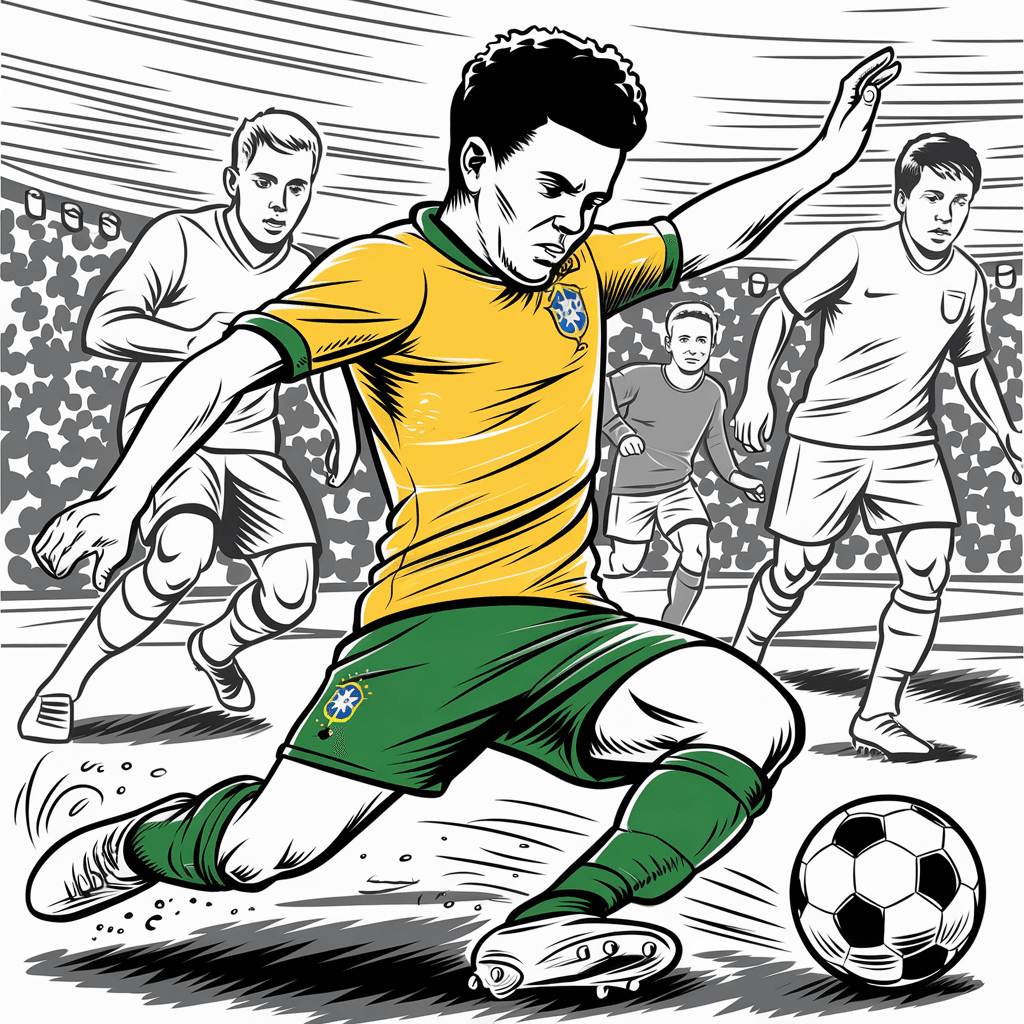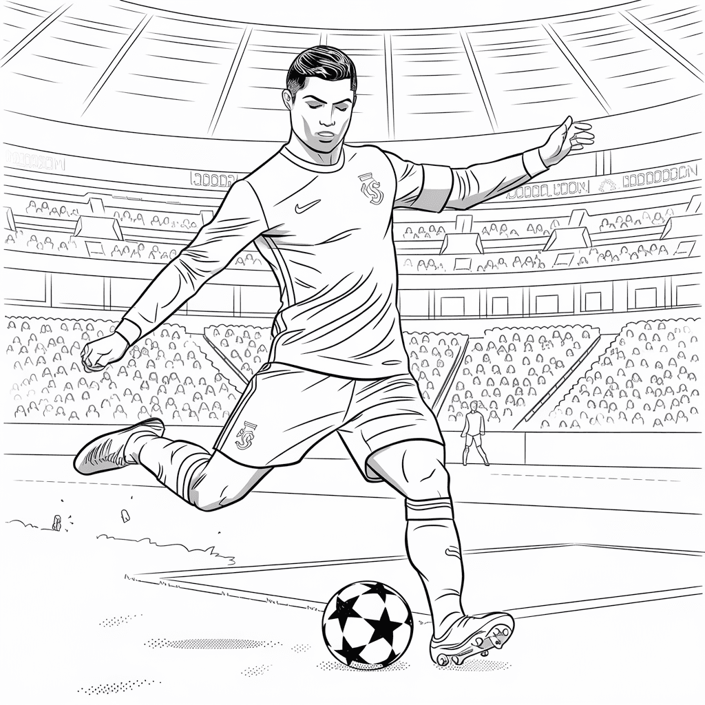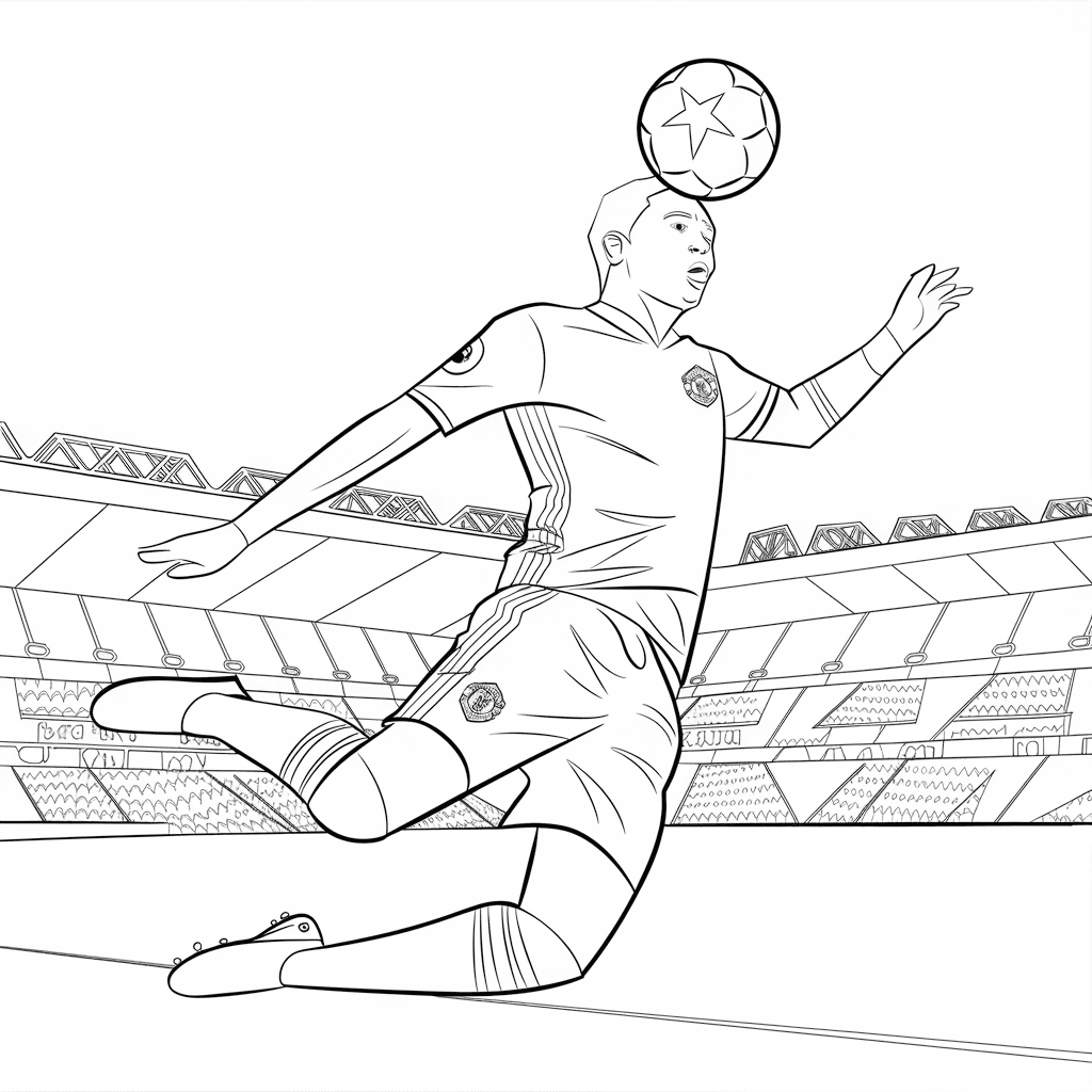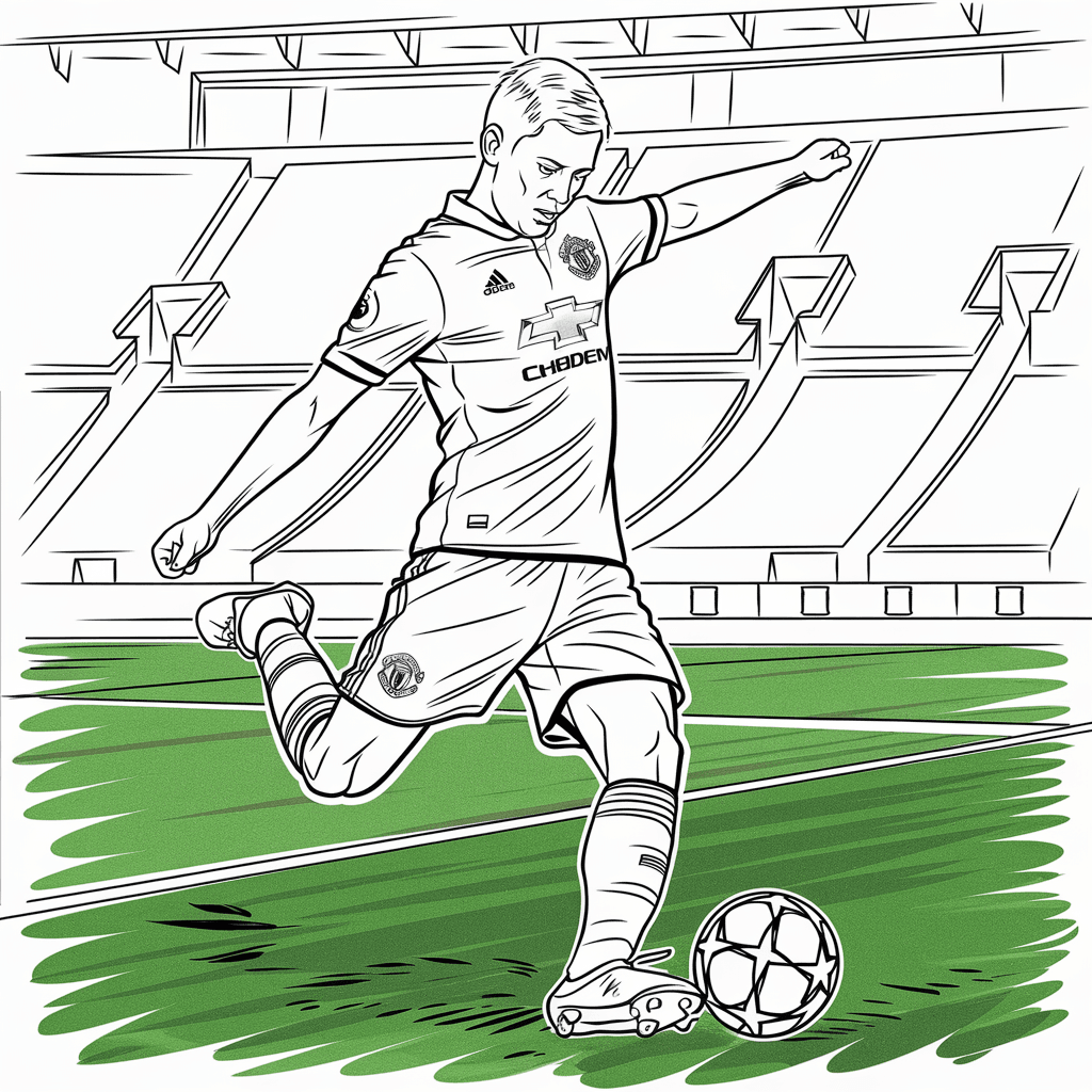 Gambar seorang pemain yang sedang menendang bola dengan penuh semangat, cocok untuk mewarnai gerakan dinamis.