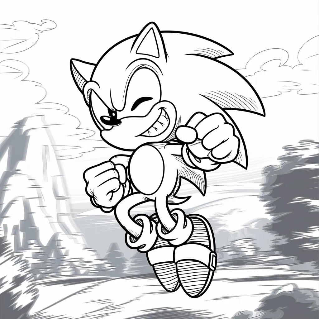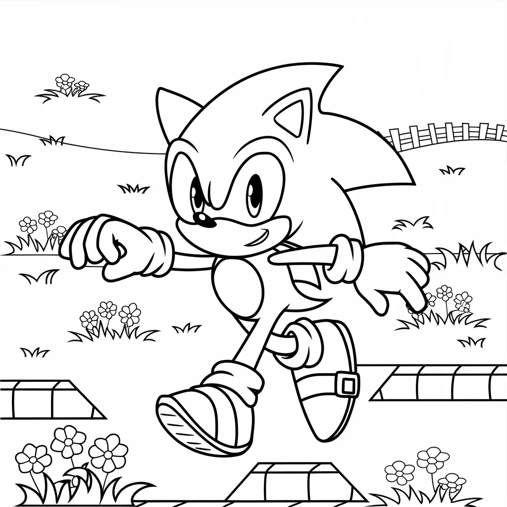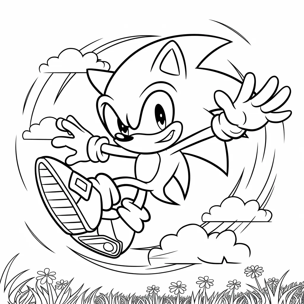 Gambar Sonic yang sedang melompat melewati platform, cocok untuk mewarnai warna-warna cerah di latar belakang.