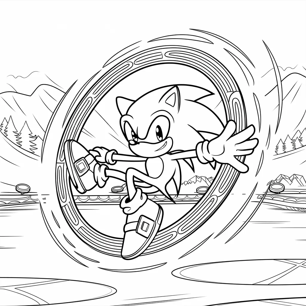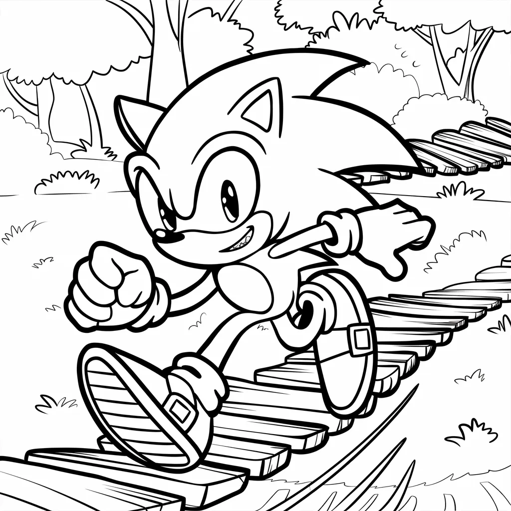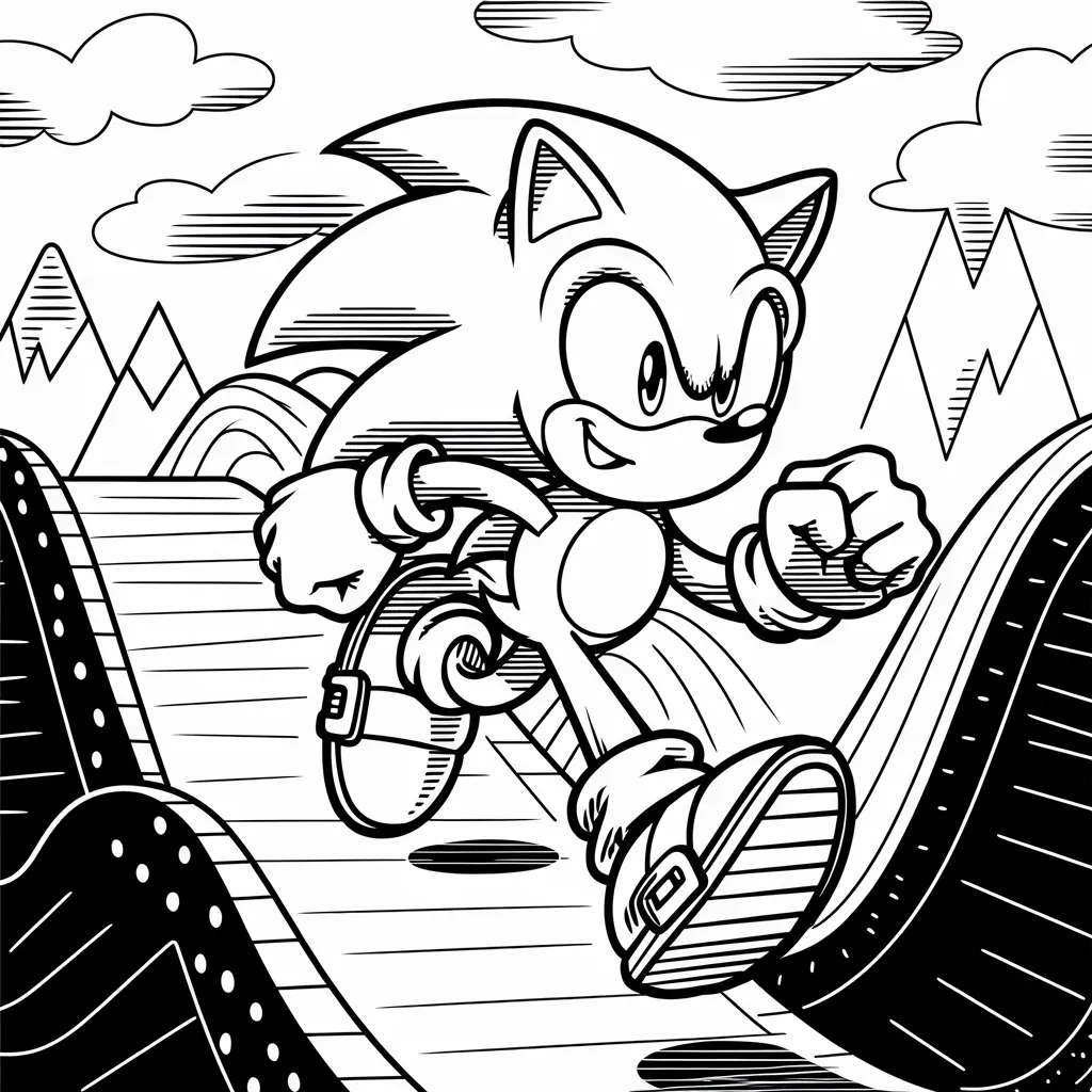 Gambar Sonic yang sedang melompat melewati platform, cocok untuk mewarnai warna-warna cerah di latar belakang.