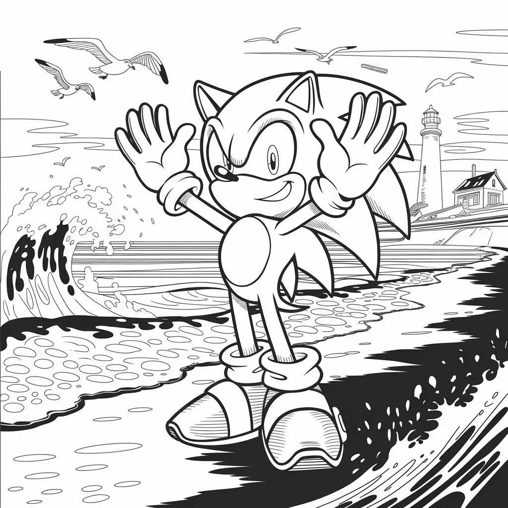 Gambar Sonic di pinggir pantai, dengan ombak dan pasir yang siap dicat.