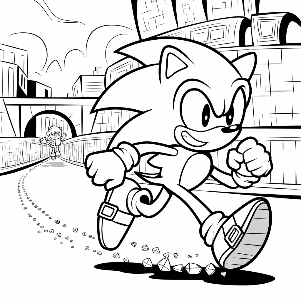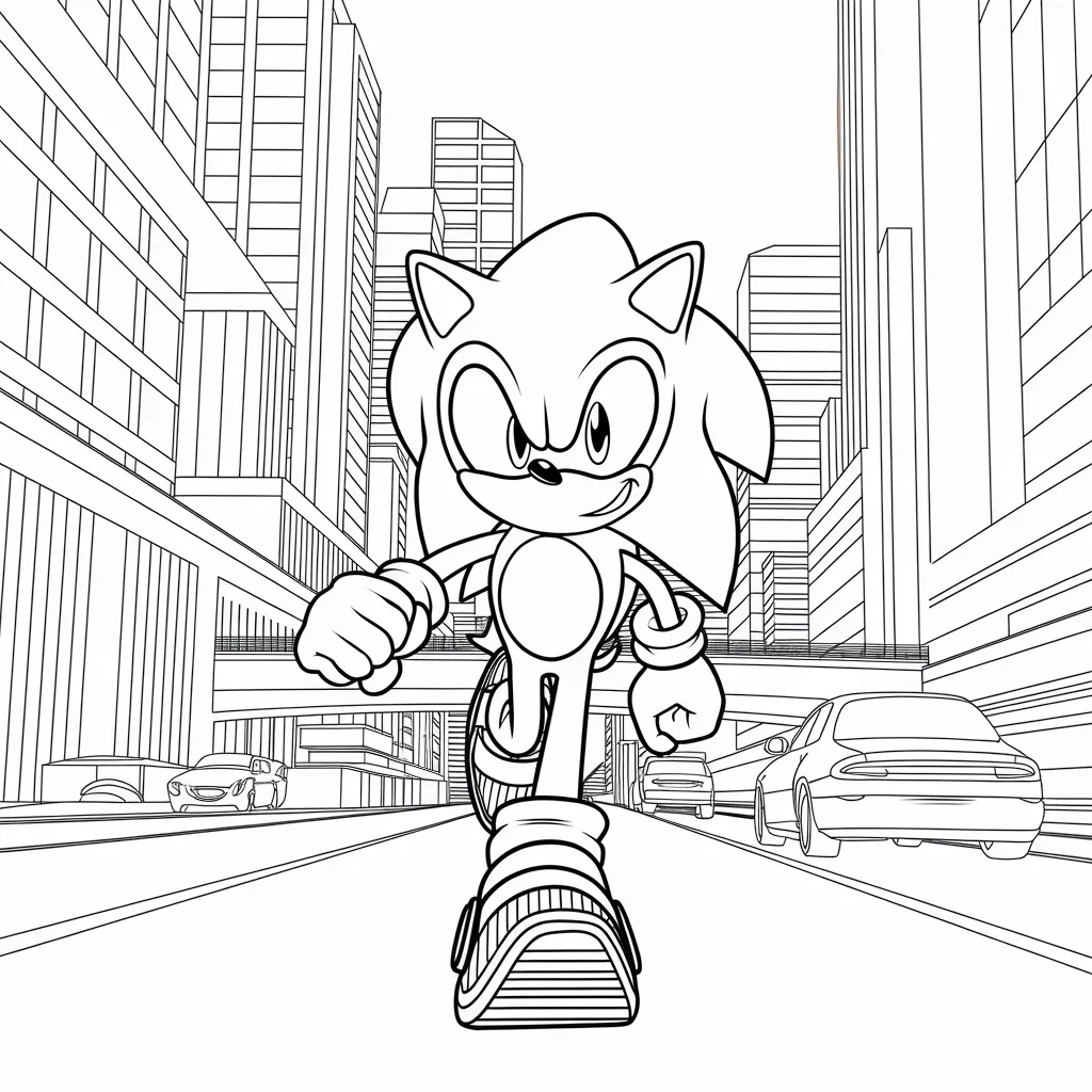 Ilustrasi Sonic yang berlari cepat di antara gedung-gedung kota modern, memberi tantangan gradasi warna.