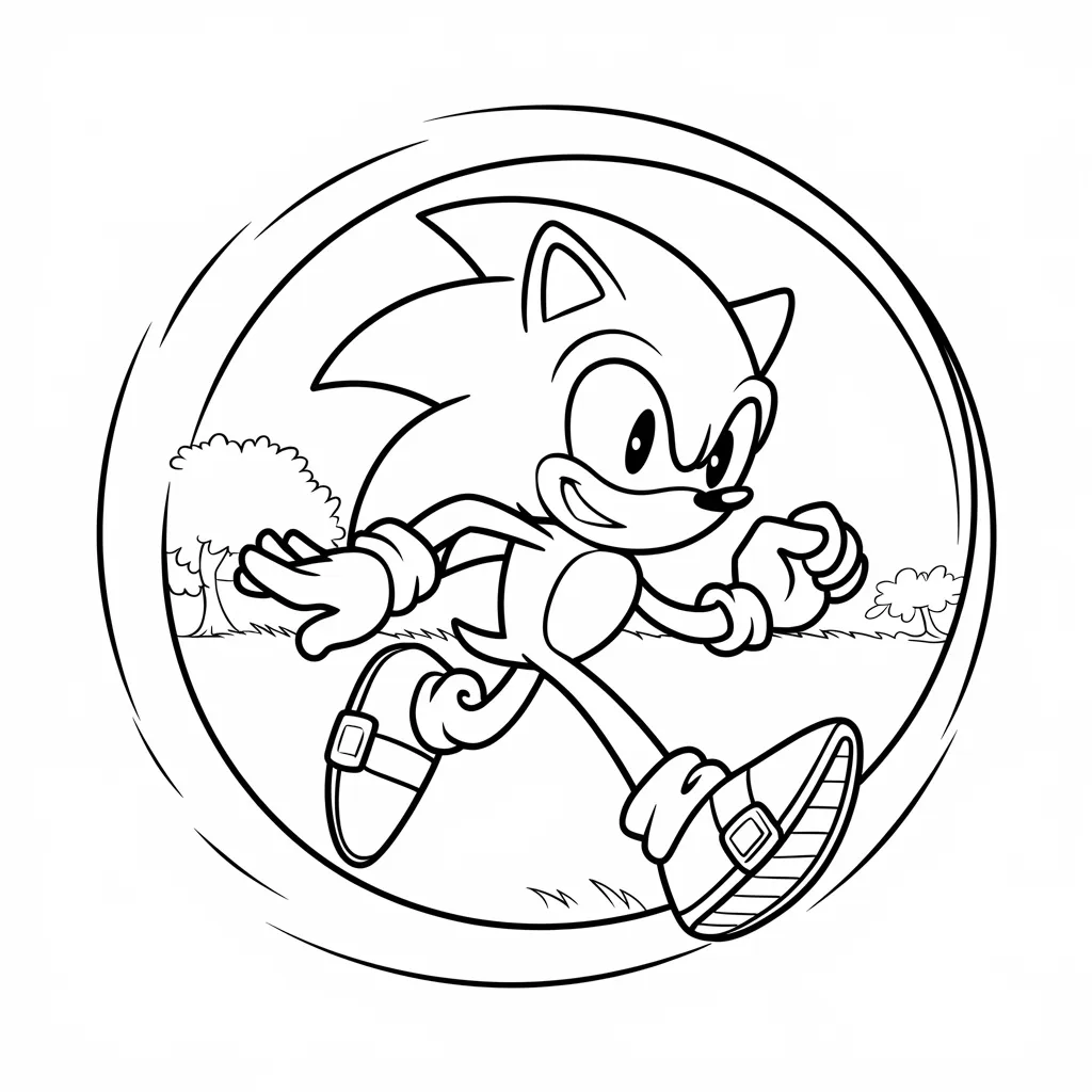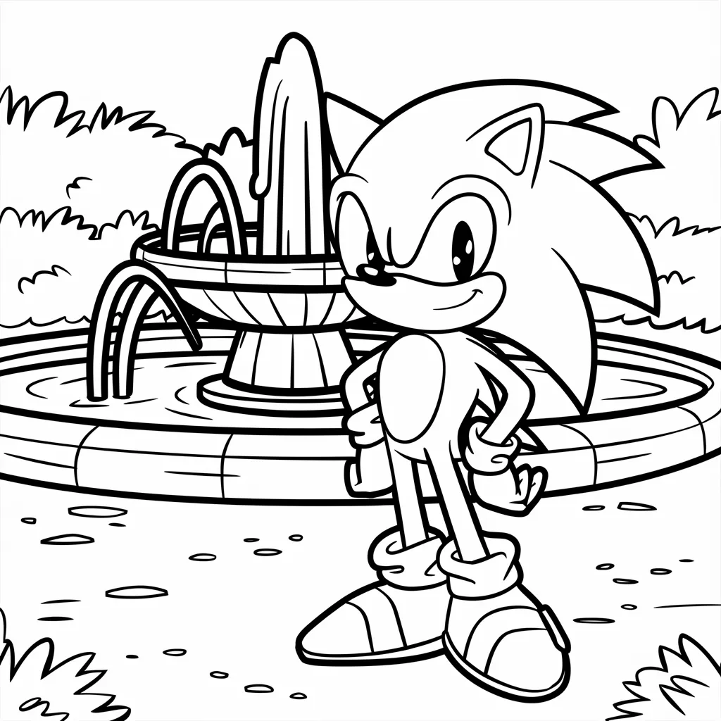 Ilustrasi Sonic di depan air mancur taman, menambah detail latar belakang yang bisa diwarnai.