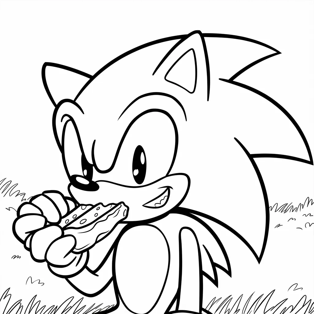 Gambar Sonic sedang menikmati camilan kecil, memberi kesempatan bermain warna pada makanan.