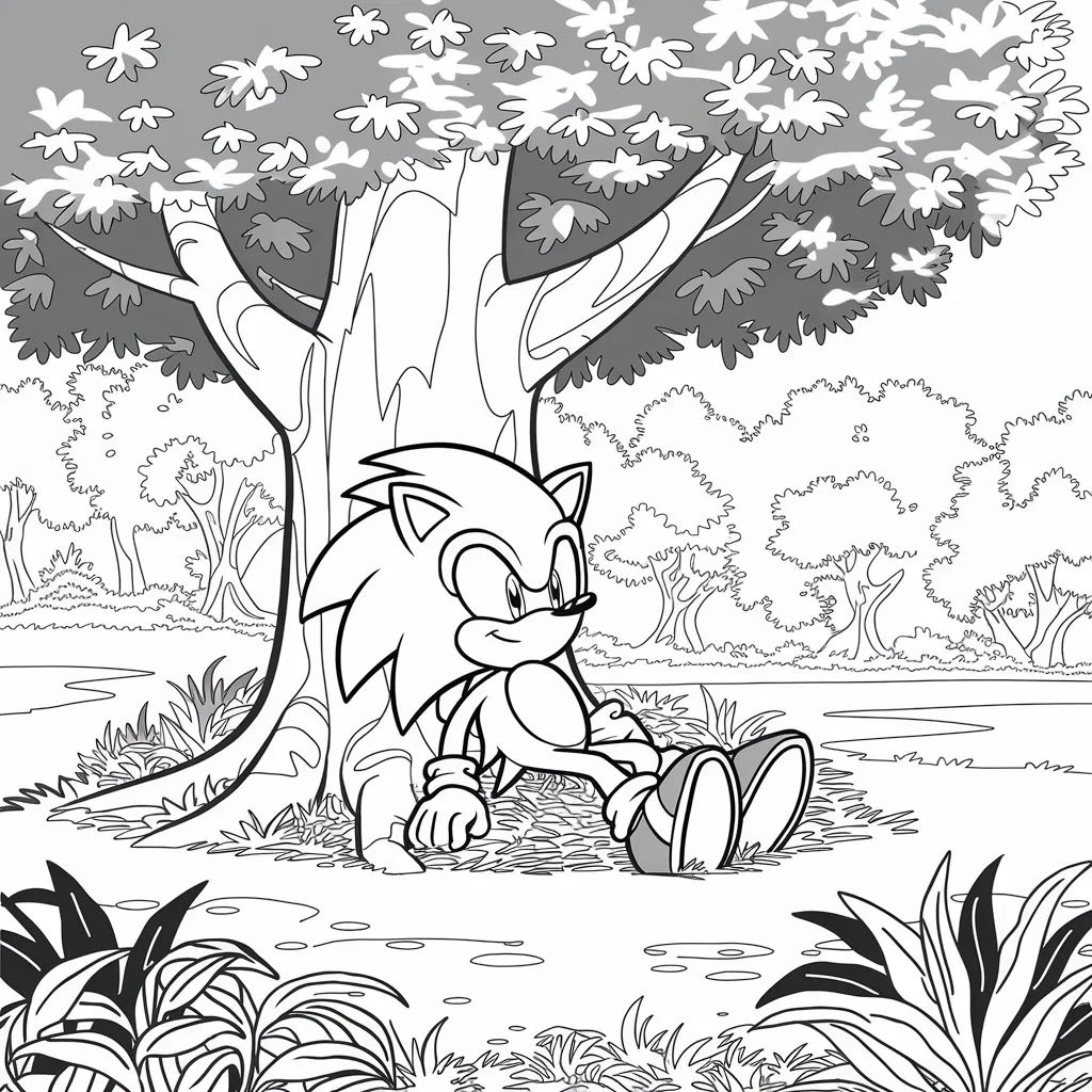 Ilustrasi Sonic yang duduk santai di bawah pohon, memberi nuansa tenang dan alamiah.
