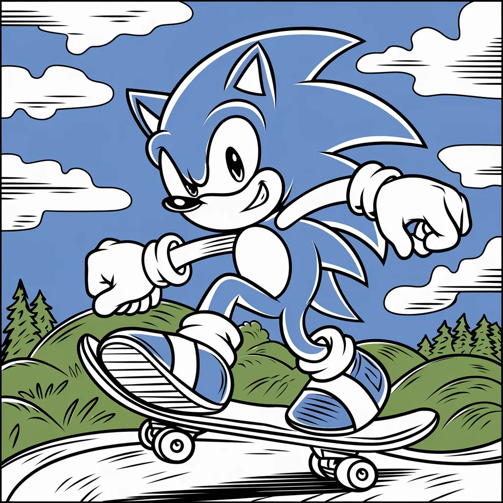 Ilustrasi Sonic menaiki skateboard, menambah elemen gaya dan modernitas.