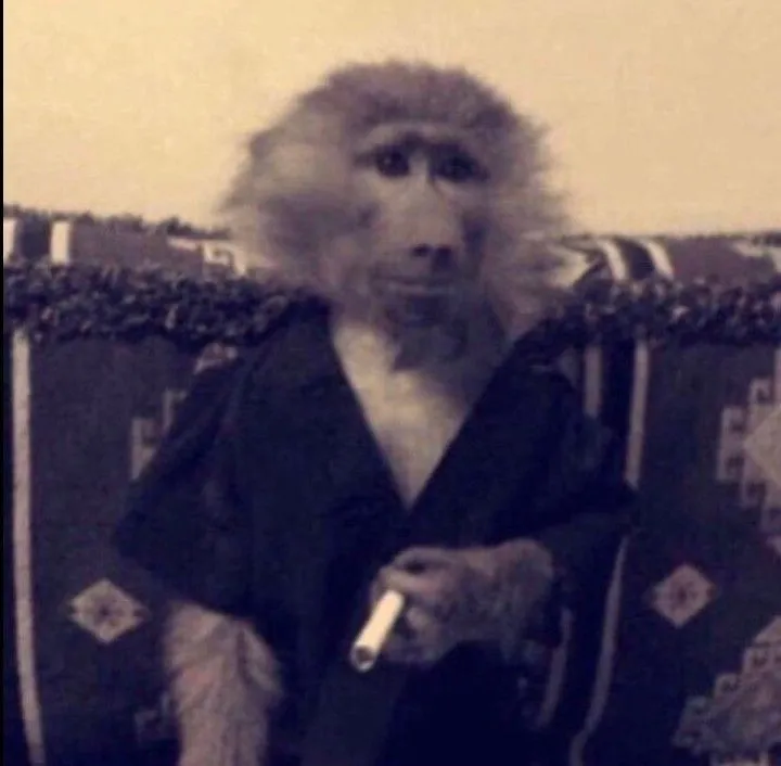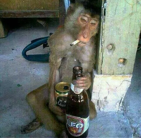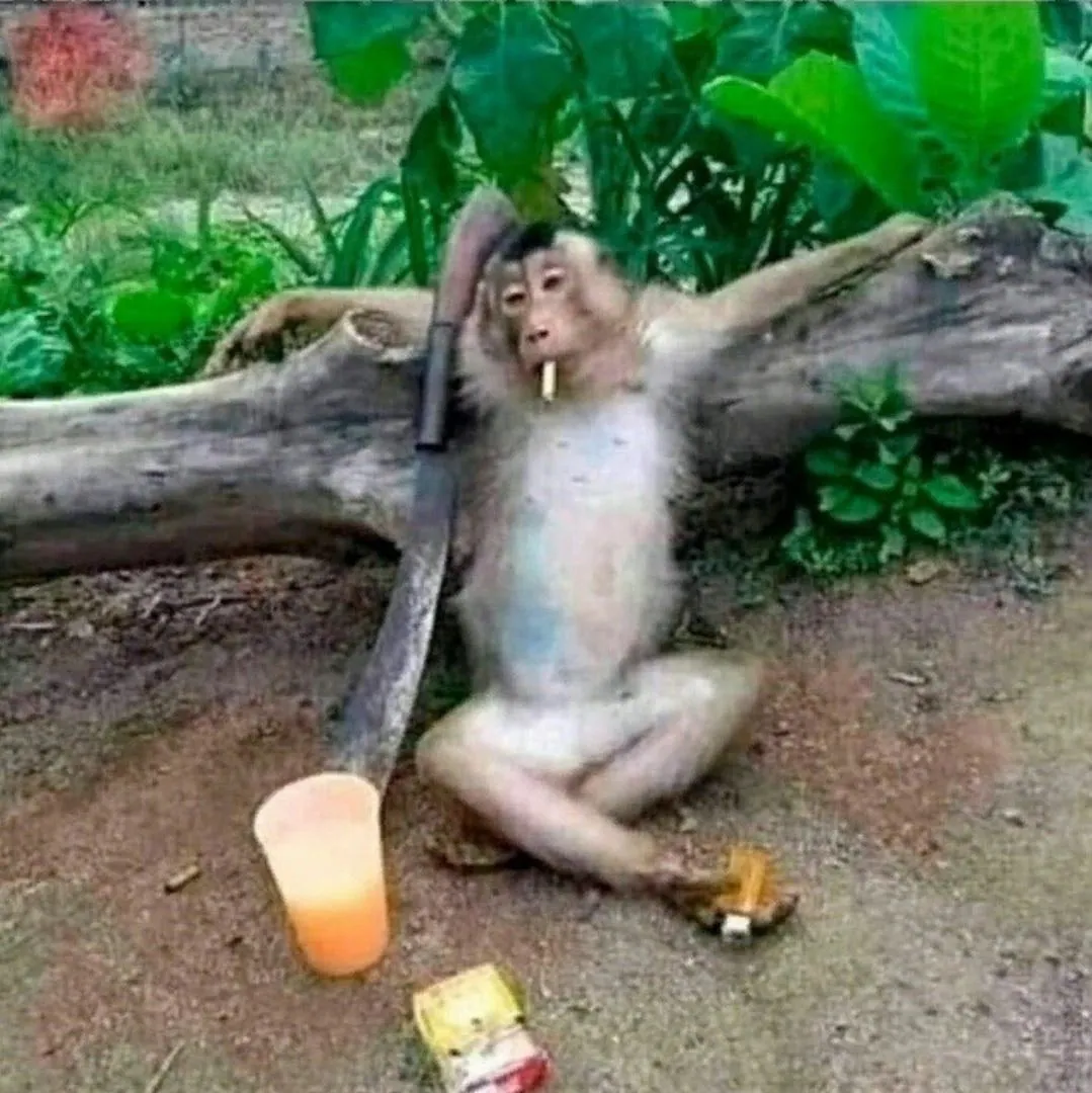 Tampak pada gamabr diatas seekor monyet yang sedang duduk santuy ditemeni rokok dan secangkir minuman lengkap dengan golok disampingnya, tampang monyet tersebut sudah terlihat seperti preman saja.