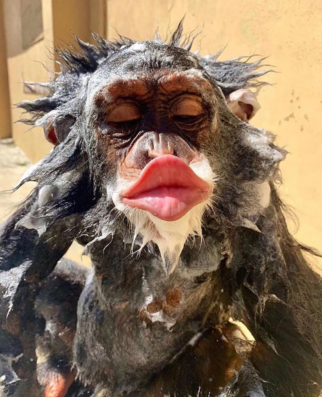 Badannya yang penuh dengan sabun dan busa putih akan menambah kesan lucu dan menggemaskan. Mungkin monyet tersebut sedang menikmati mandi, atau mungkin juga sedang bermain-main dengan sabun dan busa. Ekspresi wajahnya yang ceria akan menciptakan perasaan kebahagiaan dan keceriaan bagi siapa pun yang melihatnya.