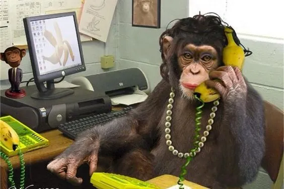 Gambar ini juga bisa diartikan sebagai parodi humor tentang situasi kantor atau kejadian lucu di dunia pekerjaan. Monyet sebagai sekretaris dengan pisang sebagai telepon menciptakan kontras yang menyenangkan dan menghibur.