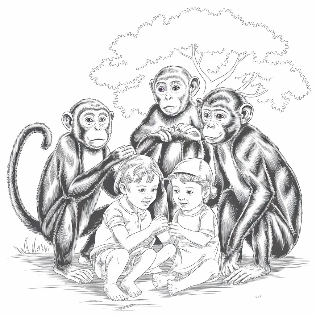 Ilustrasi monyet yang bermain dengan anak-anak manusia, mengajarkan tentang interaksi positif.