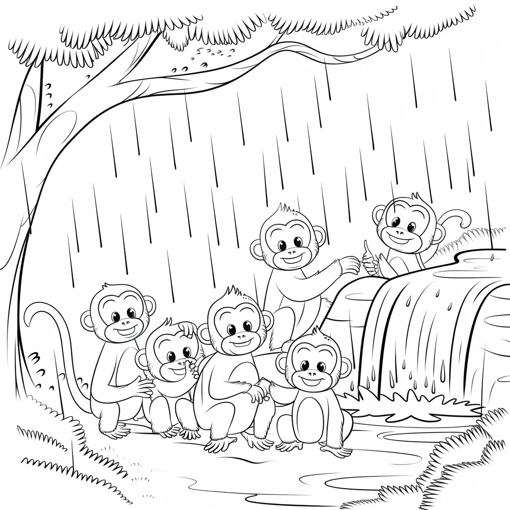 Ilustrasi monyet yang berteduh di bawah daun saat hujan turun, menambah nuansa alam.