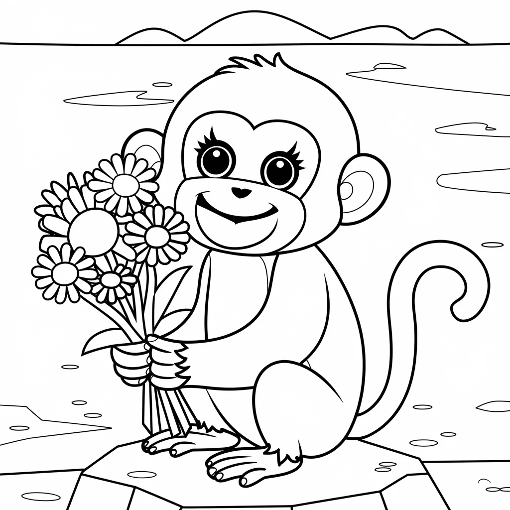 Ilustrasi monyet yang memegang bunga, memberikan kesempatan untuk mewarnai dengan warna-warna cerah.