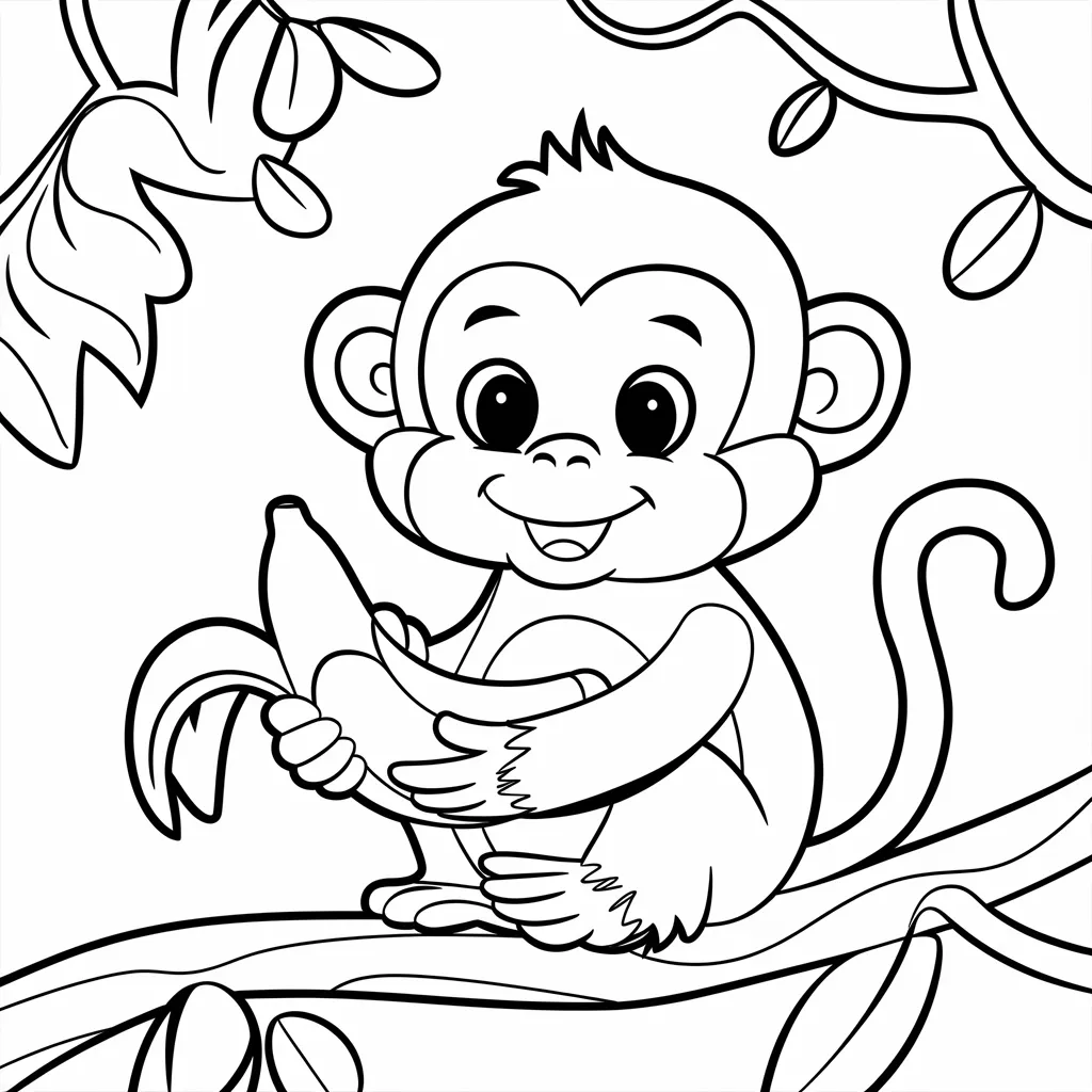 Ilustrasi monyet yang memegang pisang, makanan favoritnya, cocok untuk mewarnai dengan warna kuning cerah.