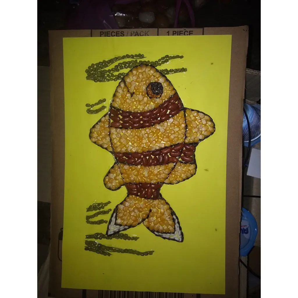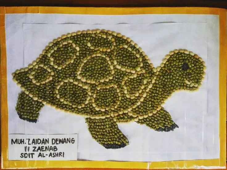 Lukisan mozaik berikutnya ini sangat simpel yakni dengan bertemakan hewan kura-kura serta perpaduan warna yakni kuning dan hijau untuk material pembuatannya sih sangat mudah untuk didtemukan yakni kacang hijau dan juga jagung,akan tetapi kalian dapat juga mencoba material lainnya dengan warna yg sama yakni hijau dan juga kuning,cukup simpel namun memiliki nilai estetis yg tinggi.