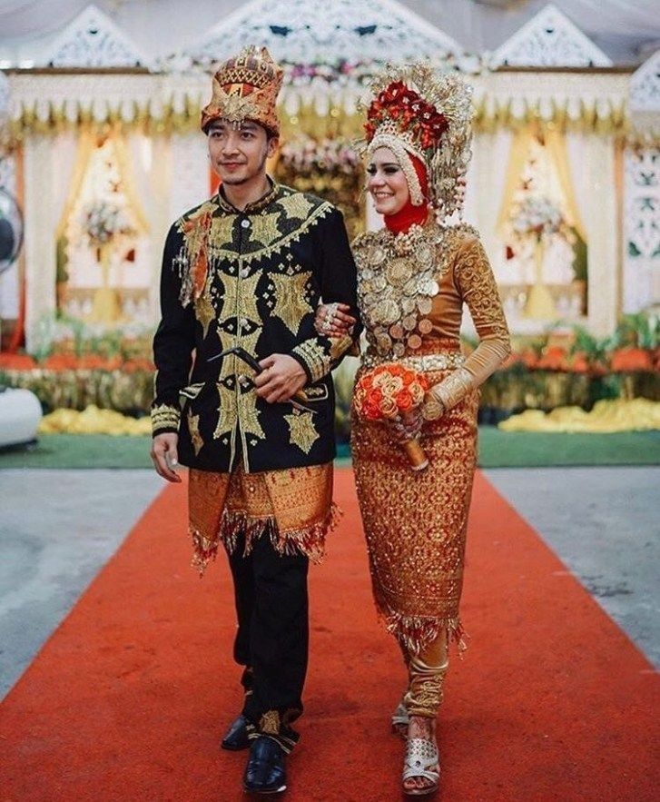 Pakaian adat pengantin Aceh adalah salah satu yang paling terkenal di Indonesia. Untuk pengantin pria, pakaian biasanya berwarna hitam dengan hiasan emas yang mencolok, menciptakan penampilan yang megah. Sementara itu, pengantin wanita mengenakan pakaian merah yang dihiasi dengan sulaman emas yang rumit, menciptakan penampilan yang memukau. Pengantin wanita juga sering memakai mahkota khas yang disebut “tutong.”