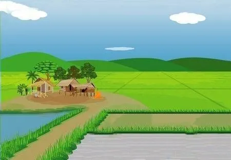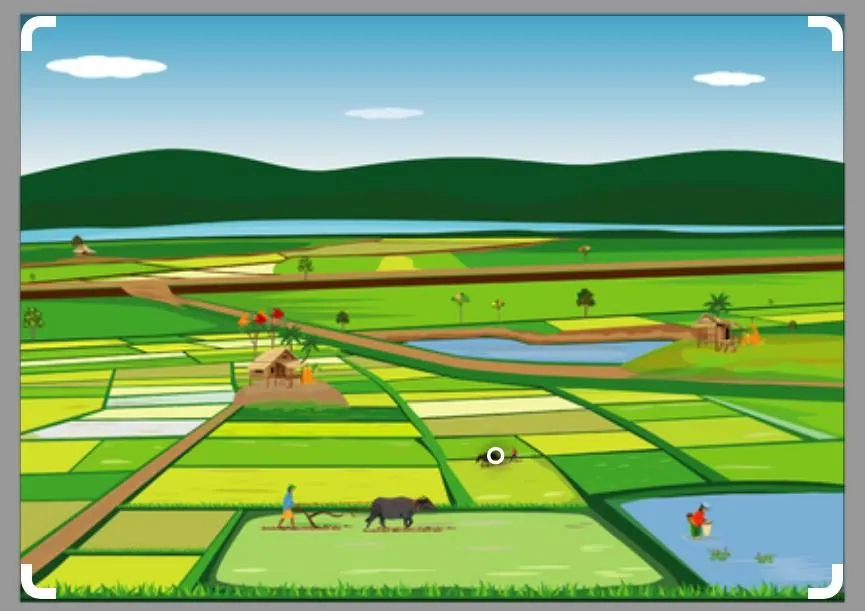 Berikut pada gambar diatas terdapat tampilan pemandangan area persawahan dengan disekitarnya terdapat rumah sederhana dan perbukitan. Adanya rumah-rumah sederhana di sekitar persawahan juga dapat memberikan kesan bahwa manusia hidup dalam keterhubungan dengan alam dan bergantung pada alam untuk kebutuhan hidupnya. Rumah-rumah sederhana tersebut juga dapat memberikan kesan bahwa manusia hidup sederhana dan menghargai sumber daya alam yang ada di sekitarnya.