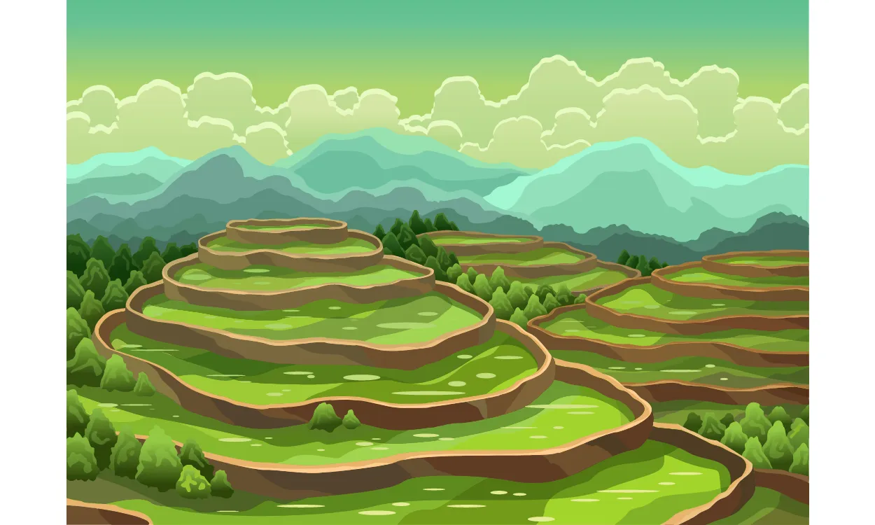 Latar belakang perbukitan hijau menambah keindahan pemandangan dan memberikan kesan harmoni dan keseimbangan antara manusia dan alam. Perbukitan hijau memberikan rasa tenang dan damai bagi para petani yang bekerja di lahan persawahan tersebut sehingga membuat mereka semakin produktif dalam bekerja.